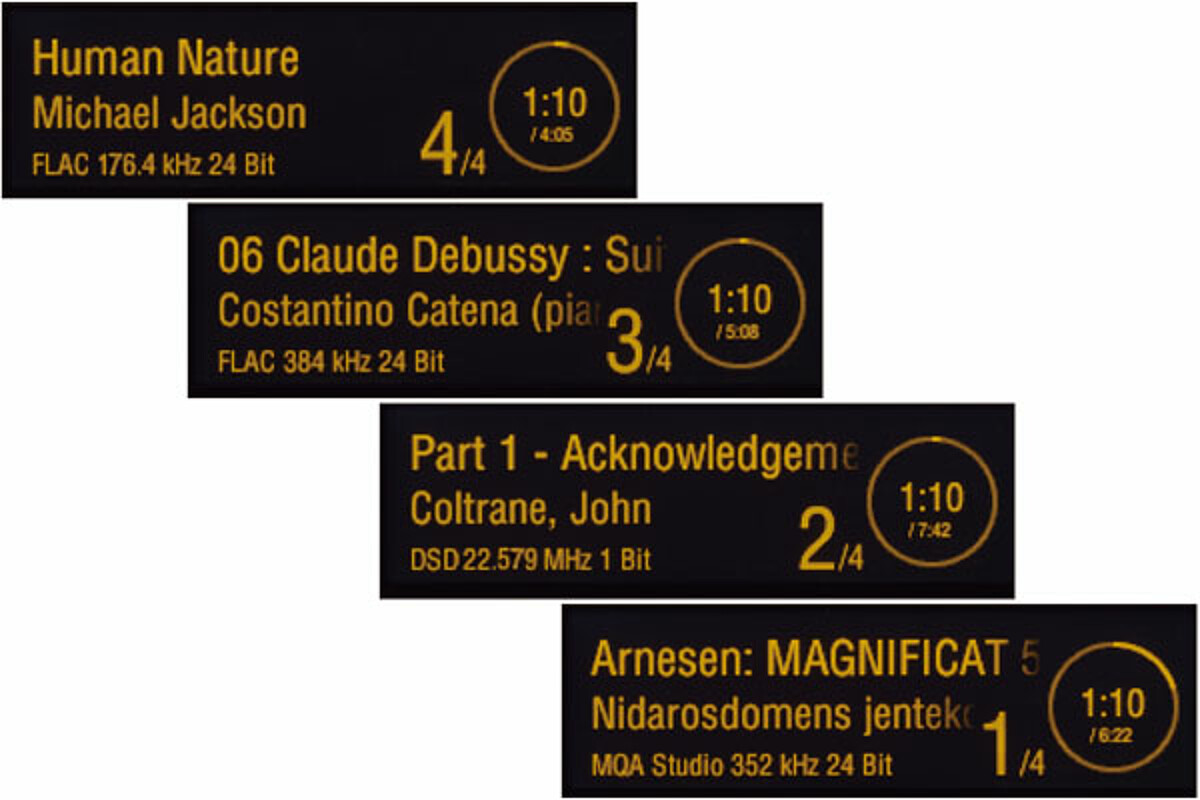 Das USB-Subsystem des NT-07 unterstützt Abtastfrequenzen von bis zu 768kHz/32bit für PCM-Dateien und 22,5MHz/1bit DSD-Daten, der optische/koaxiale Ausgang ermöglicht die Wiedergabe von 192kHz/24bit PCM. Auch eine eingebaute Core-Decodierungsfunktion für Tonquellen im MQA-Format mit drei wählbaren Modi, "off", "core decoding" und "pass-through", je nach angeschlossenem D/A-Wandler ist verfügbar. In der Mitte der Frontplatte befindet sich ein großes, leicht ablesbares, hochauflösendes EL-Display, das eine Vielzahl von Informationen wie den Namen des gerade gespielten Titels, den Namen des Interpreten, die verstrichene Zeit und das Audioformat dieser ausgewählten Quelldaten anzeigt.
