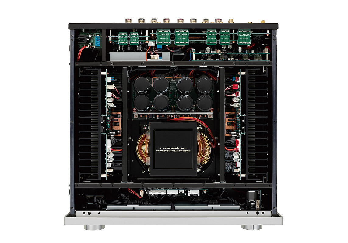 Ein hochstabiler, speziell angefertigter EI-Netztransformator und neu entwickelte, großkapazitive Filterkondensatoren (10.000µ Fx 8) sind in der Stromversorgungseinheit kombiniert, die eine sofortige Stromzufuhr und Spannungsstabilität bietet und die Anforderungen dynamischer Musikwiedergabe über leistungsfähige Lautsprecher problemlos erfüllt.