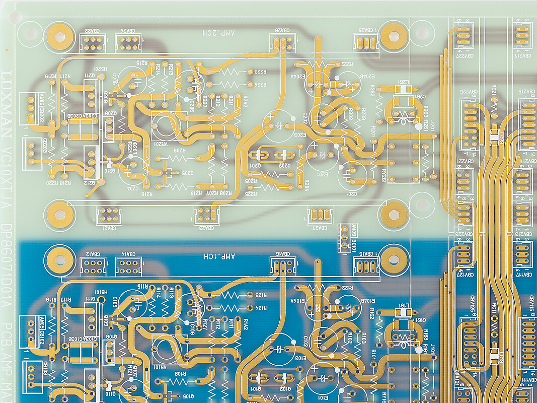 Alle Audio-Leiterplatten des C-10X verwenden ein 100 μm dickes, nicht resistives, goldbeschichtetes, abziehbares Substrat, das die Widerstandsbeschichtung eliminiert, die die Klangqualität aufgrund dielektrischer Effekte beeinträchtigt. Das ursprüngliche Know-how von LUXMAN im Streben nach hoher Klangqualität zeigt sich auch im originalen nicht-winkligen Verdrahtungsmuster, das eine glatte und stressfreie Signalübertragung erreicht, indem es die Leiterbahnbreite der Signalleitung so konstant wie möglich hält und eine glatte Kurve zeichnet.